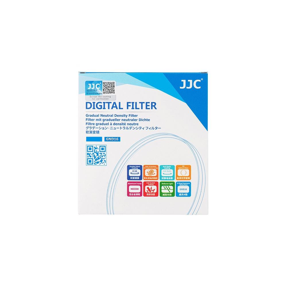 JJC přechodový filtr ND 16x se závitem 72 mm. Přechodové ND filtry se používají především v krajinářské fotografii pro snížení kontrastu při fotografování scén s velkým rozdílem jasů, se kterým si dynamický rozsah snímače fotoaparátu nedokáže poradit. Typicky se používá pro ztmavení příliš světlé oblohy.